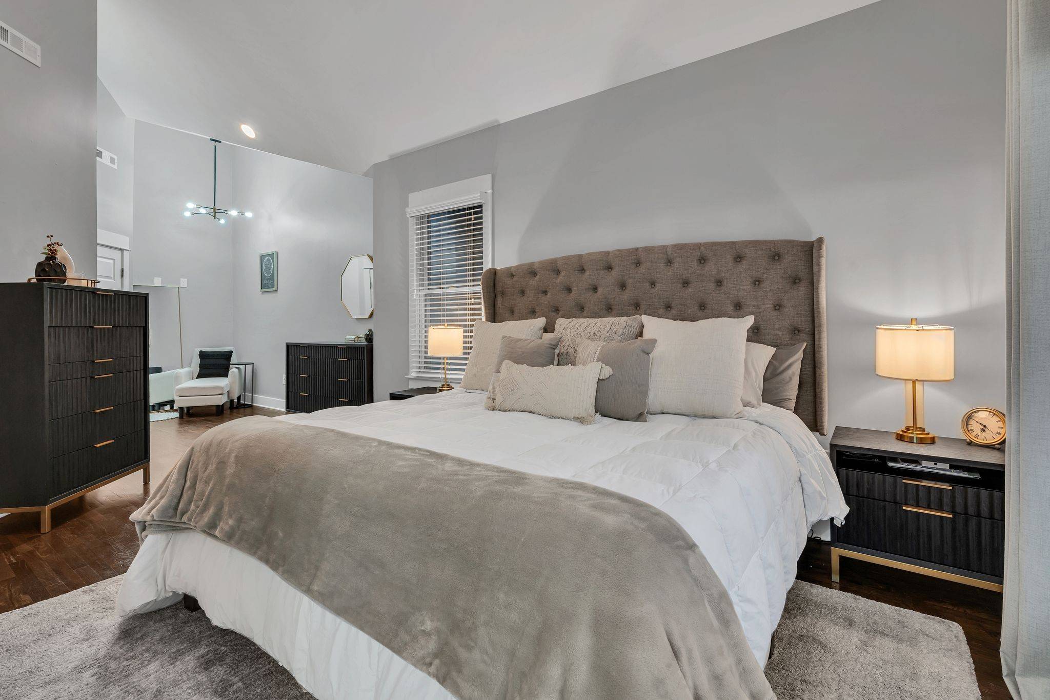 Inside, the home boasts a bright open floor plan with 10 ft ceilings on the main level, a custom shiplap fireplace, quartz countertops, and a gas stove/oven. The second floor offers two primary suites with walk-in closets for ultimate comfort and flexibility.